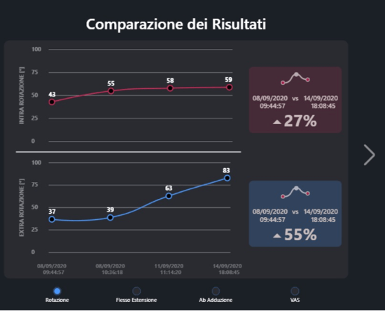 Al termine della terapia (3 sedute in una settimana), composta da un trattamento di manipolazione fasciale e due da esercizi in biofeedback in studio e esercizi assegnati a casa (una volta al giorno), il paziente riferisce un significativo aumento del ROM sui vari piani dello spazio e un miglioramento della sintomatologia dolora sulla scala VAS.